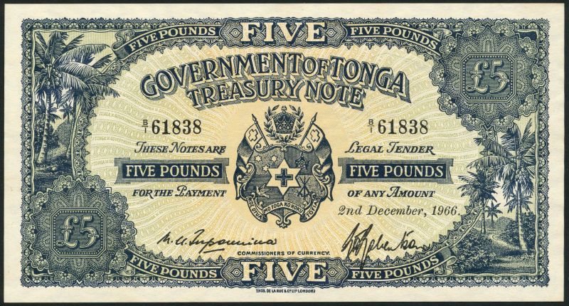 Government of Tonga, 4 shillings, 24 October 1960, prefix D/1, brown, arms at centre, palm trees at left and right, three printed signatures below, £1, 2 December 1966, red, prefix D/1 and £5, 2 December 1966, blue, prefix B/1