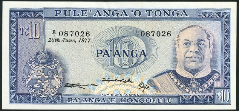 Government of Tonga, 1/2 pa'anga (2), 1975,1977, brown, 1 pa'anga (2), 1975,1977, green, 2 pa'anga (2), 1975,1978, red, 5 pa'anga, 1978, violet and 10 pa'anga, 1977, blue, arms at left, all King Taufa'ahau at right together with Solomon Islands $2,5 and 10, all Elizabeth II at right, signature 1