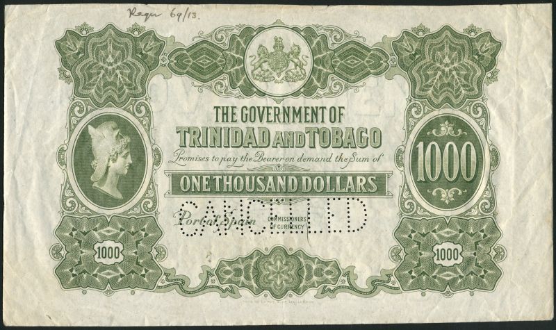 (†) Government Issue specimen $1000, Port of Spain, ND (19-), green, arms at top centre, head of Liberty at left, value at right, reverse green, cherubs and arms at centre, value at left and right