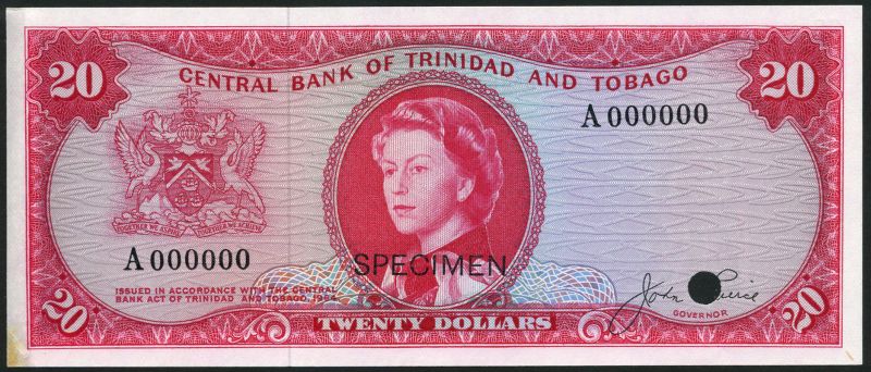 (†) Central Bank of Trinidad and Tobago, colour trial $1, purple, $5, brown and pale blue-green, $10, olive green and $20, red, all ND (1964), all serial number A 000000, all Elizabeth II and arms, Pierce signature