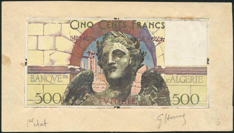 Banque de L'Alrgerie/Tunisie, obverse proof of a 500 francs, ND (1947), multicoloured, winged angel at centre with Roman ruins in background, value at low left and right