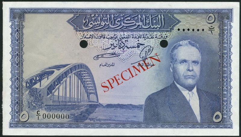 Banque Centrale de Tunisie, colour trial 5 dinars, ND 91960), zero serial numbers, blue and multicoloured, Habib Bourguiba at right, bridge at left, reverse blue, colonnade at left, arms at centre