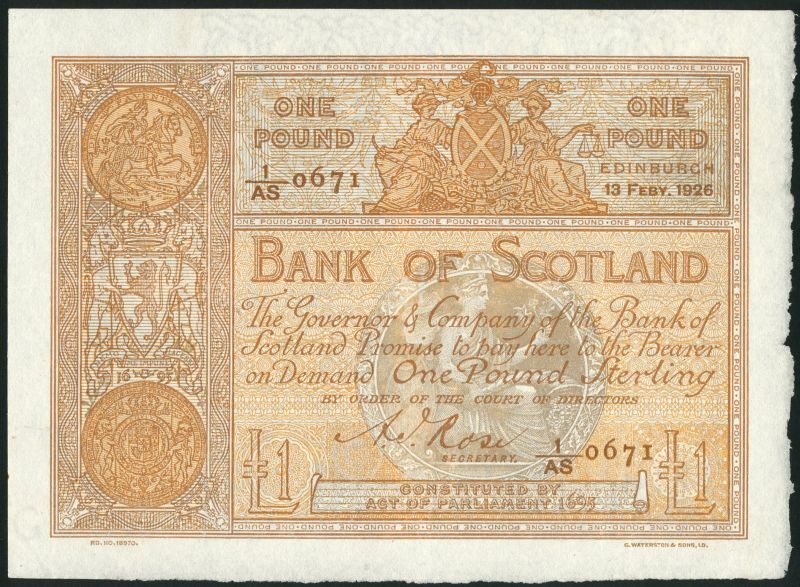 Bank of Scotland, £1, 13 February 1926, serial number 1/As 0671, orange-brown and grey, arms top centre, arms at left, Scotia in circular grey panel at low centre, Rose signature, also £5, 10 June 1926, serial number 4/K 4161, design as previous note