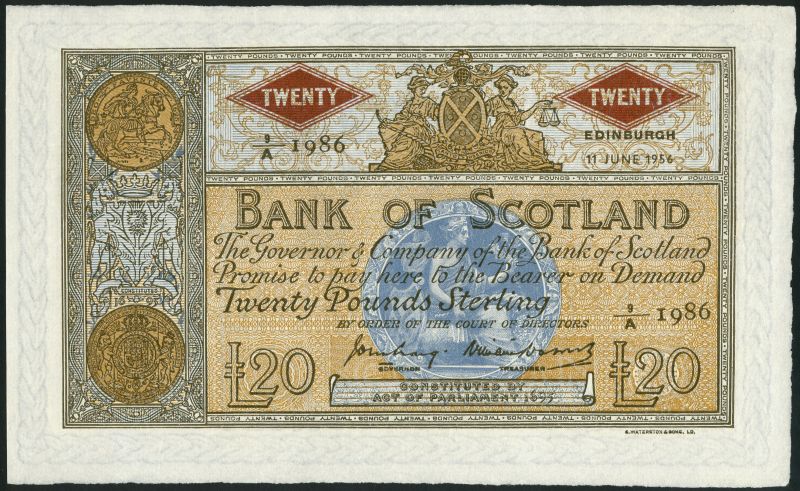 Bank of Scotland, £20, 11 June 1956, serial number 9/A 1986, orange-brown and grey, arms top centre, arms at left, Scotia in circular blue panel at low centre, value in red diamond top left and right, Craig and Watson signatures low centre