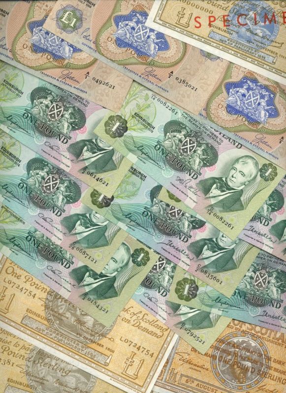 Bank of Scotland, £1 (3),1931,1950,1953, orange-brown, Scotia in grey, £1 (2), 1957,1960, Scotia in blue, specimen £1,1961, £1 (3), small format, 1961,1964,1965, also £1 (3), 1968,1969, arms at centre and £1 (19), 1970,1971,1972,1973,1974,1976,1977 (2),1978,1979,1981 (3),1983,1984,1988 (4), green, Sir Walter Scott at right