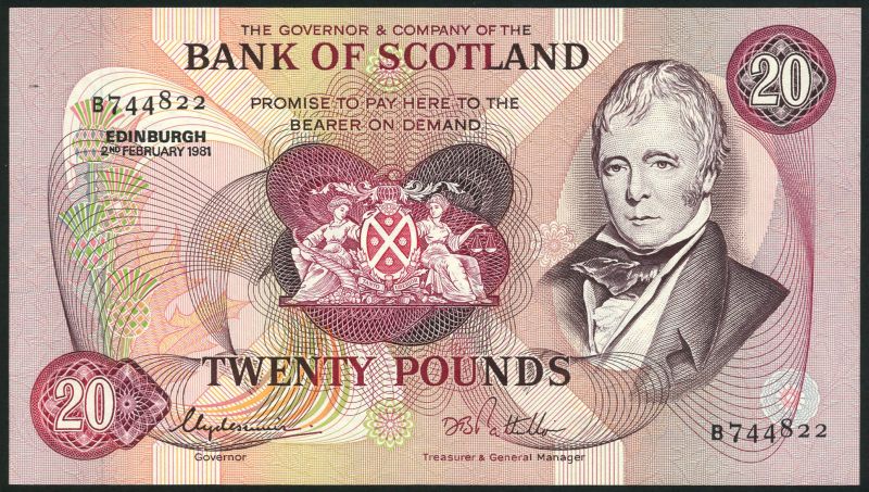 Bank of Scotland, £5 (4), 1971,1983,1988,1990, blue and multicoloured, £10 (2), 1974, serial number A 002201, the second dated 1986 and prefix ZB, brown and £20, 1981, purple, all Sir Walter Scott at right, arms at centre