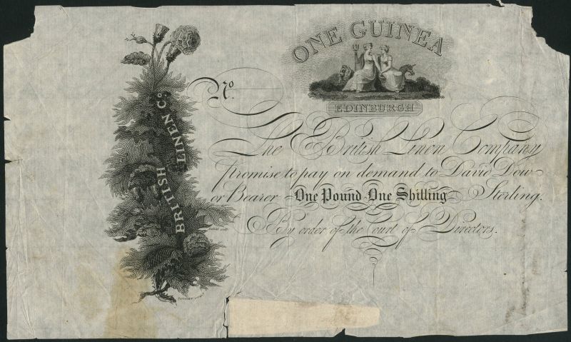 British Linen Company, proof 1 guinea on India paper, ND (ca1800), black and white, allegorical maidens top centre with lion and unicorn, bank title and border of roses and thistles at left, pay to 'David Dow or bearer' in text at centre