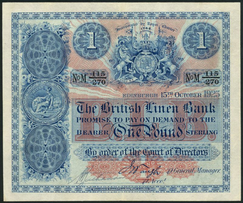 The British Linen Bank, £1, 15 October 1925, serial number M 115/270, blue, red sunburst pattern at centre, arms top centre, Britannia left centre, printed signature of Waugh and manuscript signature low centre, reverse blue, Britannia at centre