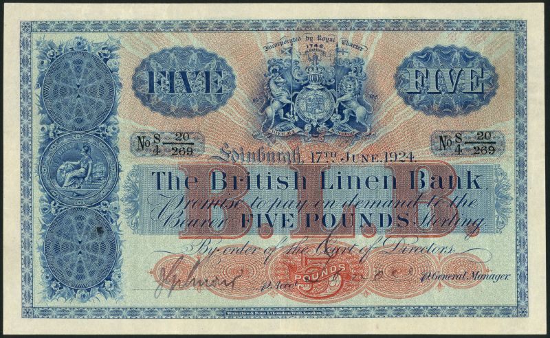 British Linen Bank, £5, 17 June 1924, serial number S/4 20/269, blue with red sunburst design at centre, arms top right centre, Britannia left centre, value top left and right, manuscript signates below, reverse blue, Britannia at centre, value at left and right
