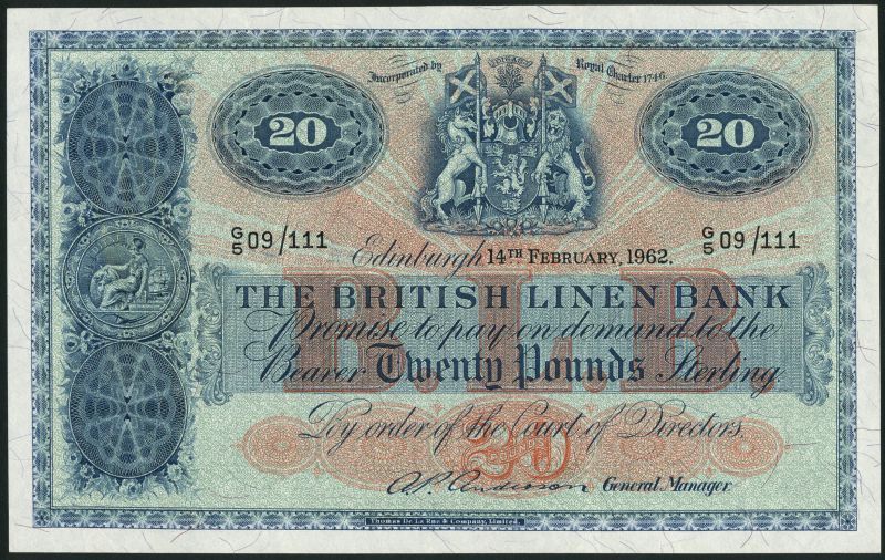 British Linen Bank, £20, 14 February 1962, serial number G/5 09/111, blue with red sunburst design at centre, arms top centre, value top left and right, Britannia at left centre, printed signature of Anderson low centre, reverse blue, Britannia at centre, value at left and right