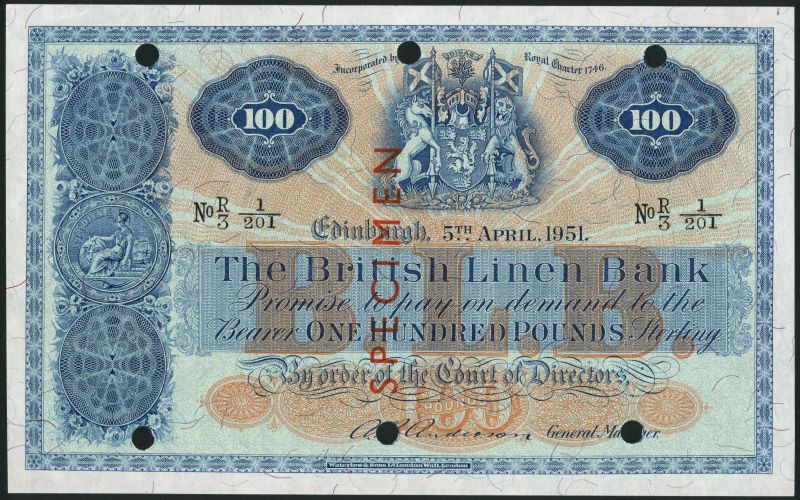 British Linen Bank, specimen £100, 5 April 1951, serial number R/3 1/201, dark blue on red and light blue underprint, arms at top centre, flanked by values
