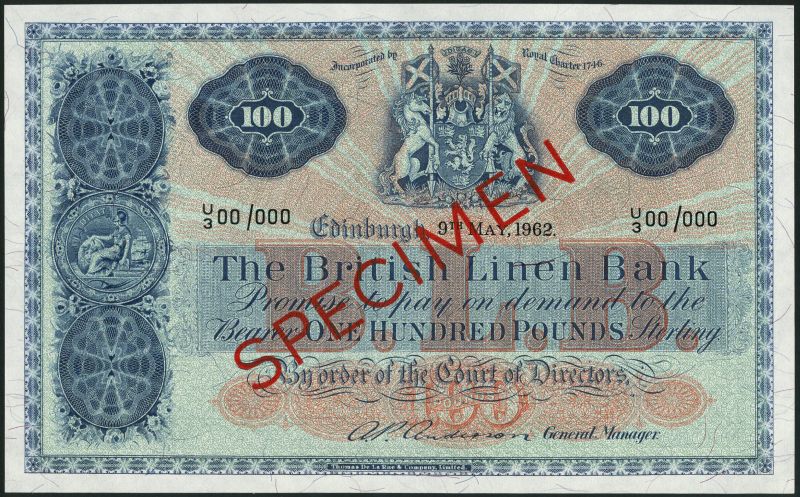 British Linen Bank, specimen £100, 9 May 1962, serial number U/3 00/000, blue with red sunburst design at centre, arms top centre, value top left and right, Britannia at left centre, printed signature of Anderson low centre, reverse blue, Britannia at centre, value at left and right