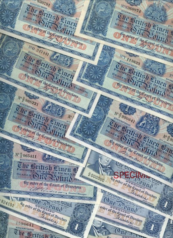 British Linen Bank, £1 (7), 1926,1927,1932,1935,1950,1951,1959, blue and red, arms and Britannia, also £1 (7), 1962, specimen £1,1963,1964,1966,1967 (3), £1 (4), specimen £1, 1968,1968,1969,1970, blue, Sir Walter Scott, also £5 (4), 1961,1964,1964 and a specimen of 1968