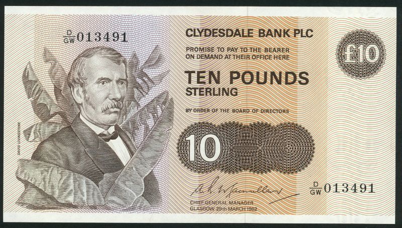 Clydesdale & Bank of Scotland Limited, £5 (3), 1961,1962,1969, blue and multicoloured, arms at right, also Clydesdale Bank plc, £1 (2), 1982,1983, £5 (4), 1982,1987,1989,1990, blue, Robert Burns at left and £10 (3), 1982,1986,1988, brown, Livingstone at left