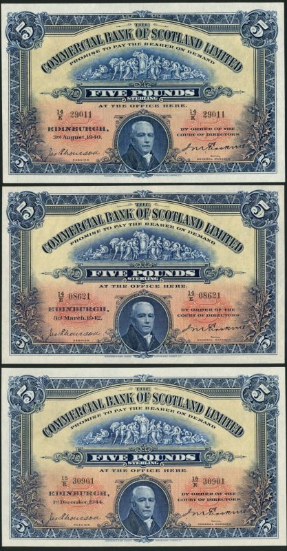Commercial Bank of Scotland Limited, £5 (3), 1940,1942,1944, blue, red and yellow, classical frieze top centre, Sir John Pitcairn low centre, all Thomson and Erskine signatures, reverse blue, bank building at centre