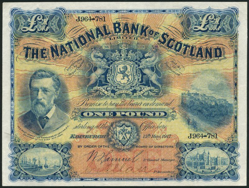 National Bank of Scotland Limited, £1, 15 May 1917, serial number J 964-781, blue, yellow with red-brown sunburst pattern at centre the Marquess of Lothian at left, arms top centre, one printed signature of Samuel, one manuscript signature