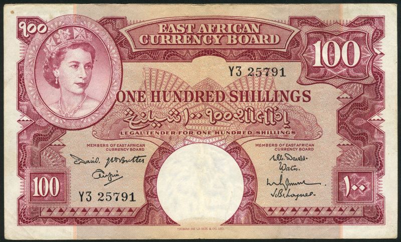 (x) East African Currency Board, 100 shillings, ND (1961), prefix Y3, red, Elizabeth II top left, Government of Malta 10 shillings, ND (1954), green, Cuschieri signature, also Boer War, Green Point Track 1 shilling