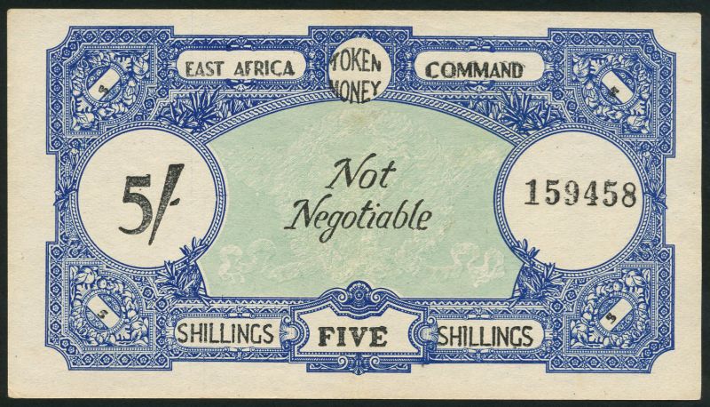 East African Command Prisoner of War money (Italian Somaliland), 5 shillings, ND (ca 1940-1941), serial number 159458, blue and green, value at left, ornate detail around a pale green central panel