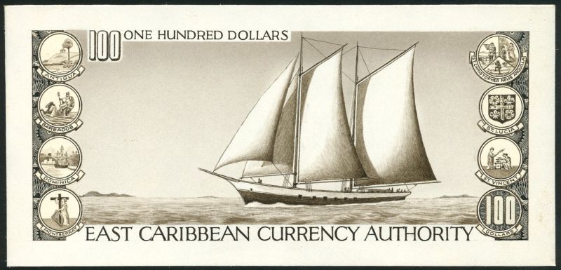 (†) East Caribbean Currency Authority, hand painted reverse composite essay for a $100, ND (c.1960), black and brown, sailing boat at centre, arms of the territories at left and right