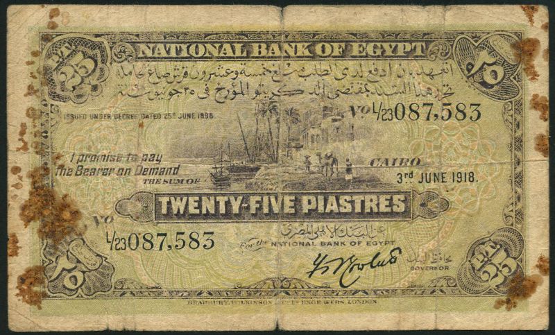 National Bank of Egypt, 25 piastres, 3 June 1918, prefix L/23, purple and multicoloured, the banks of the Nile at centre, value in violet tablet at centre, value at each corner, Rowlatt signature, reverse blue and orange, wings top centre, value in field