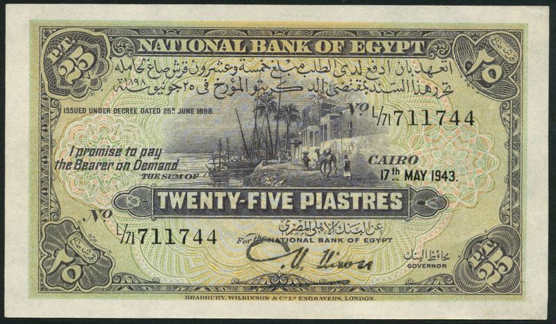 National Bank of Egypt, 25 piastres (2), 1943,1945, prefix L/71 and L/78, purple and multicoloured, the banks of the Nile at centre, value in violet tablet at centre, value at each corner, Nixon signature, reverse blue and orange, wings top centre, value in field