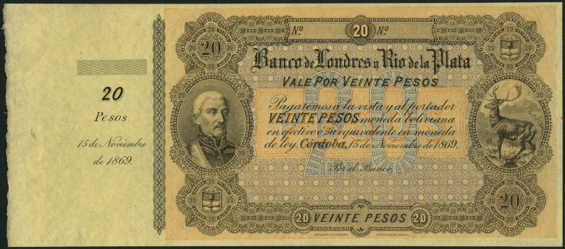 (†) Banco de Londres y Rio de la Plata, Argentina, specimen 20 pesos, Cordoba, 15 November 1869, black, pale blue and orange, General Belgrano at left, stag at right