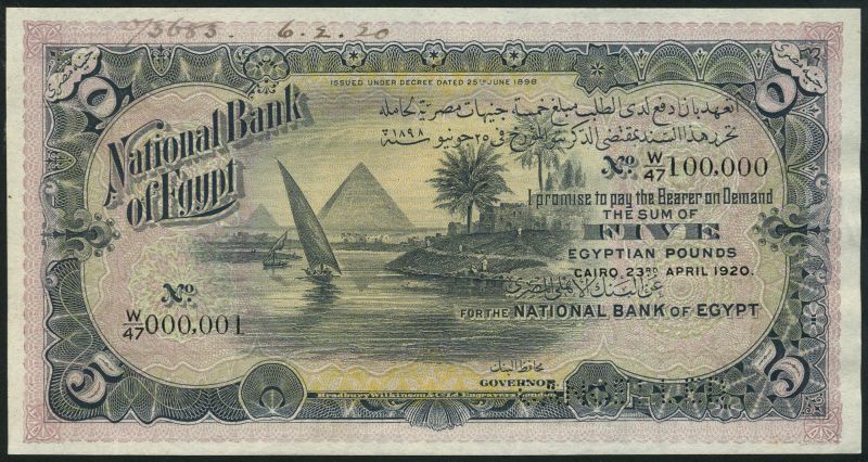 (†) National Bank of Egypt, specimen £5, 23 April 1920, serial number W/47 000001-W/47 100000, black, lilac and pale green, feluccas on the Nile, pyramids in background, reverse grey, lilac and pale orange, value at left and right