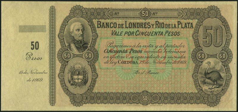 (†) Banco de Londres y Rio de la Plata, Argentina, specimen 50 pesos, Cordoba, 15 November 1869, black, pale green and pink, General Belgrano at left, ostrich at right