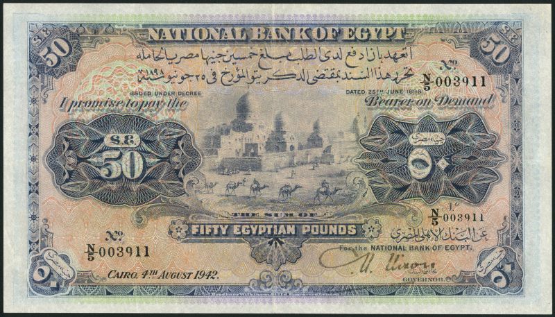 National Bank of Egypt, £50, 4 August 1942, serial number N/5 003911, purple and multicoloured, caravan train and Mameluke tombs at centre, value at each corner, Nixon signature, reverse purple and green, value at each corner