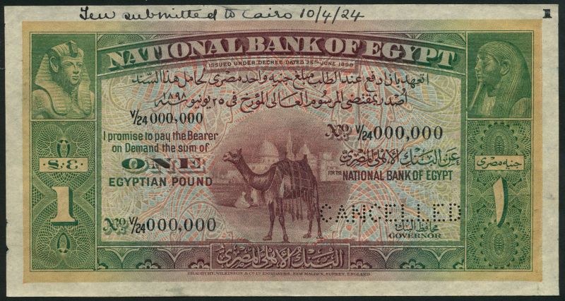 (†) National Bank of Egypt, colour trial £1, ND (type of 1924), serial number V/24 000000, purple, green and pale blue, camel at centre, Cairo in the background, value at left and right, reverse purple, pale blue and green, value and Bank initials