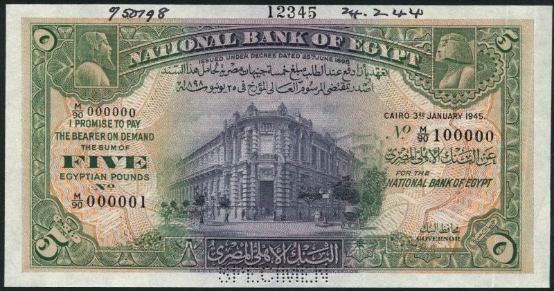 (†) National Bank of Egypt, specimen £5, 2 January 1945 and 3 January 1945, prefixes M/80 and M/90 respectively, violet, green and orange, the National Bank building at centre, value at left and at each corner, reverse red and blue, well at centre, value at left and right