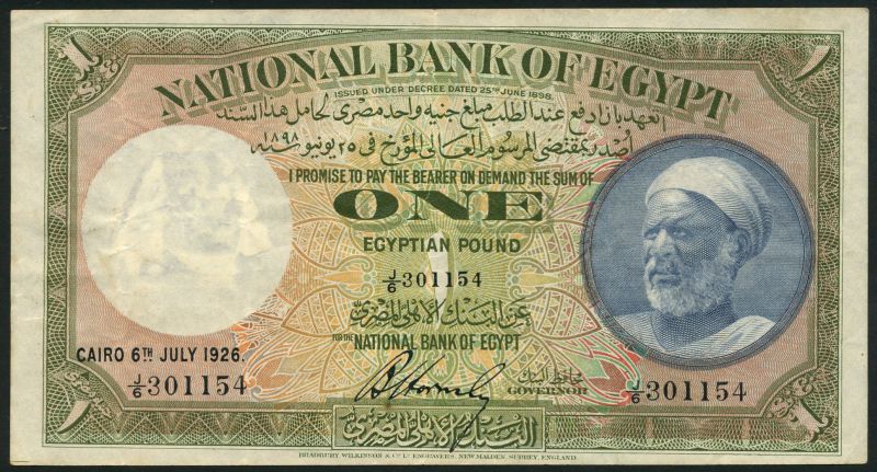 National Bank of Egypt, £1, 6th July 1926, serial number J/6 301154, green and pale pink, Fellah (Edrees) in blue-violet circular vignette at right, Hornsby signature, reverse violet, the Mosque of al-Mansour Seif el-Dein Qa'la Un at centre