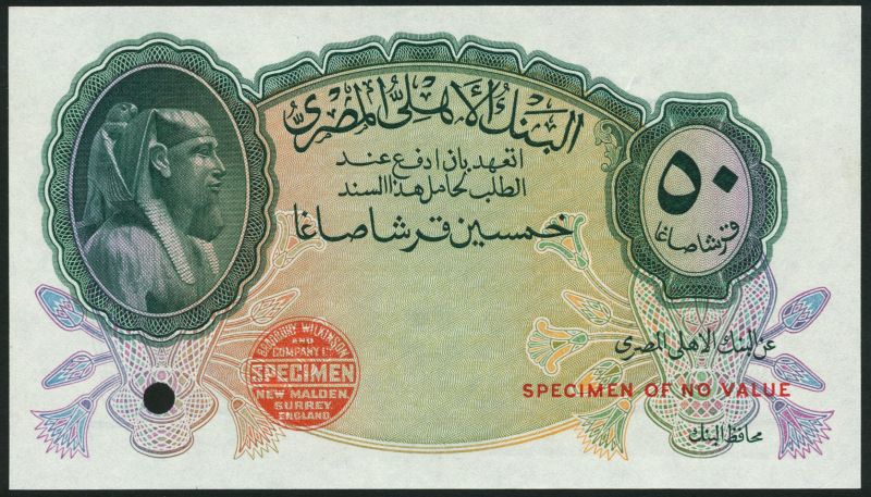 National Bank of Egypt, specimen 50 piastres, ND (type of 1935), no serial numbers, green and multicoloured, Tutankhamen top left, value top right, reverse blue, arms top left, value top right