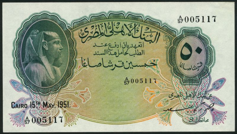 National Bank of Egypt, 50 piastres,1951, prefix A/57, green and multicoloured, Tutankhamen top left, value top right, Saad signature, reverse blue, arms top left, value top right