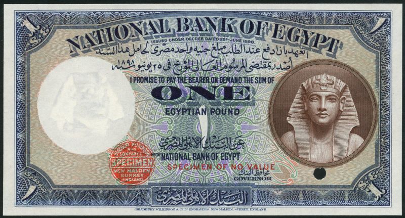 National Bank of Egypt, specimen £1, ND (type of 1930), no serial numbers, blue and multicoloured, Tutankhamen at right, reverse green, the Mosque of al-Mansour Seif el-Dine Qalawun at Bein al-Qasrein, value at left