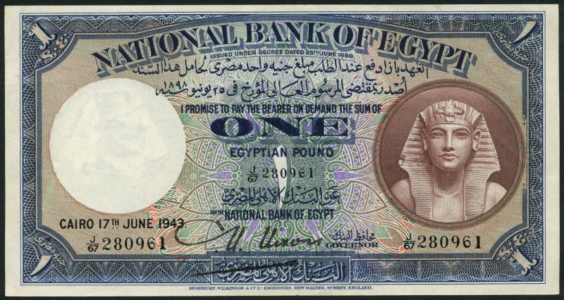 National Bank of Egypt, 1 pound, 17 June 1943, serial number J/67 280961, blue and multicoloured, Tutankhamen at right in brown circular vignette, Nixon signature, reverse green, the Mosque of al-Mansour Seif el-Dine Qalawun