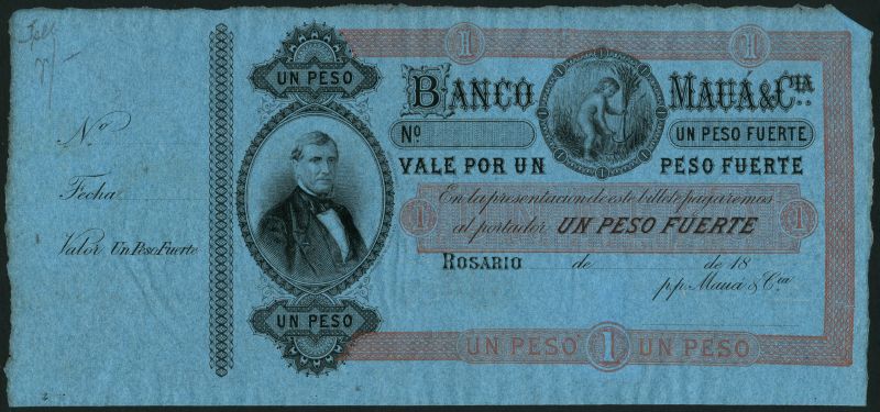 (†) Banco Maua & Cia., Argentina, specimen 1 peso fuerte, Rosario, 18- (1865-1868), blue and brown, cherub harvesting top centre, Irineo Evangelista de Souza (Vizconde de Maua) at left