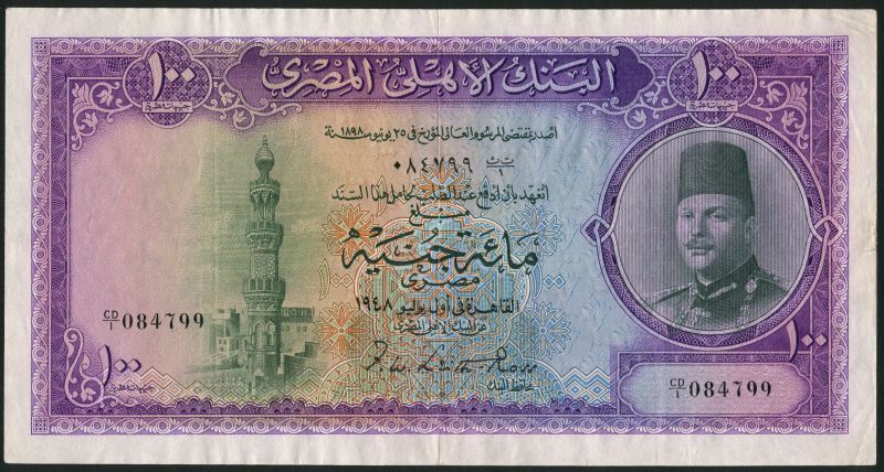National Bank of Egypt, £100, 1948, serial number CD/1 084799, violet and multicoloured, King Farouk at right, minaret at left, Leith-Ross signature, reverse violet, Mosque at centre, value low left and right