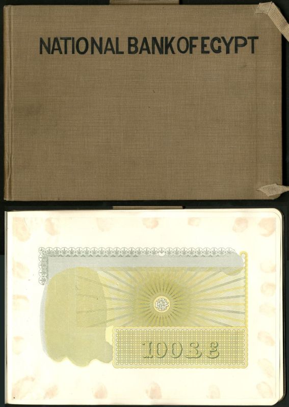 (†) National Bank of Egypt, a linen bound booklet with tile in black 'NATIONAL BANK OF EGYPT', containing stage proof underprints for the 50 piastres, £1,£5,£10,£50 and £100, undated but for the series of 1899-1912, also included are two half £10 notes in blue and white, feluccas and Philae, type of 1899