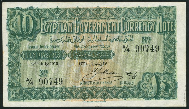 Egyptian Government Currency note, 10 piastres, 17 July 1916, prefix A/4, green and pale orange, value at left and right, Wahba signature, reverse blue and pale orange, the Colossi of Memnon at centre