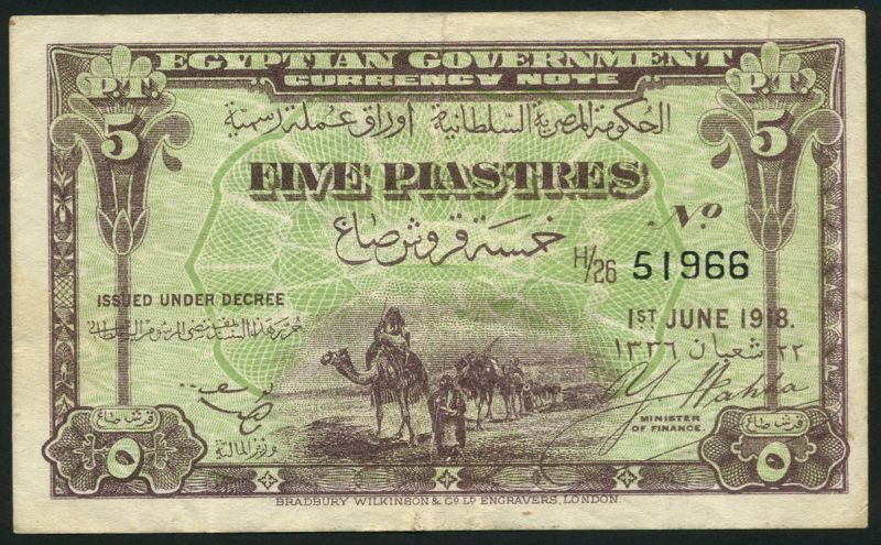 Egyptian Government Currency note, 5 piastres, 1 June 1918, prefix H/26 51966, violet and pale green, camel train, Wahba signature, reverse blue, sphinx at left and right