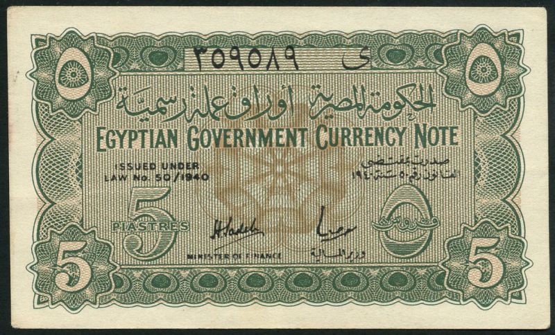Egyptian Government Currency note, 5 piastres (3), law of 1940, green and brown, Sadek, Badawy and Sedky signatures respectively, reverse lilac, the Aswan Dam