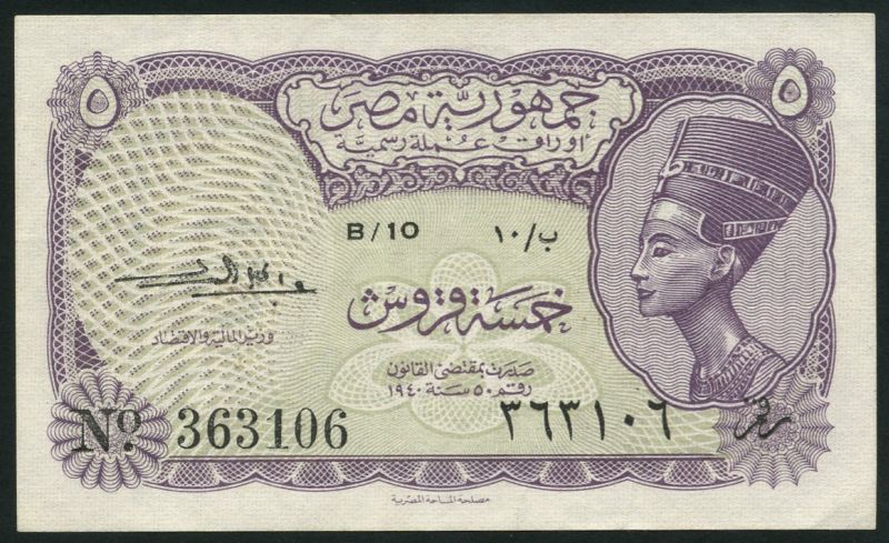 Egyptian Government Currency note, 5 piastres, 1953, prefix B/10 363106, violet, white and pale green, Nefertiti at right, El Amary signature, shading at left to obscure King Farouk in the watermark after the Revolution, reverse brown, value at left and right