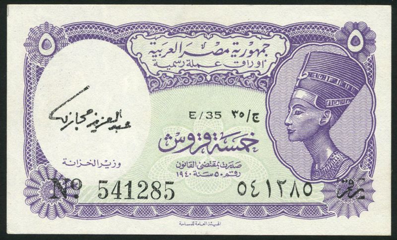 Egyptian Government Currency note, 5 piastres (3), law of 1940 (1958,1971), violet and green, Nefertiti at right, Salah Eldin and Hegazy signatures, also 5 piastres, (1998), green and brown, El Ghareeb signature