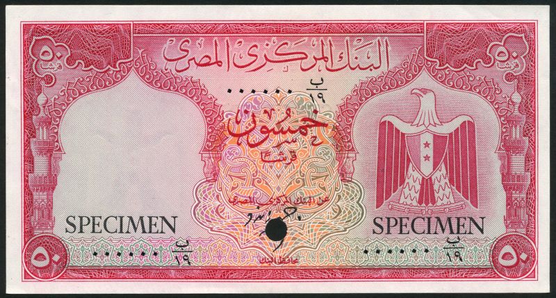 (†) Central Bank of Egypt, specimen colour trial 50 Piastres, ND (ca 1965), series 19, zero serial numbers, signature 12, red on multicoloured underprint, arms of U.A.R. at right, reverse red, denomination in guilloches, overprinted SPECIMEN in black on obverse and reverse, one punch hole