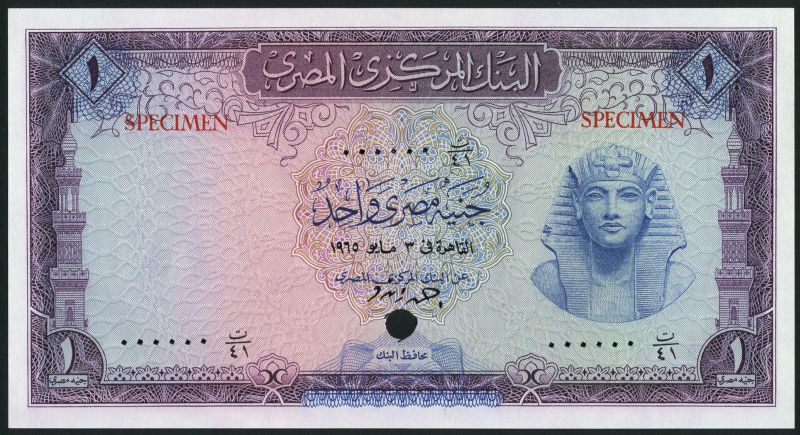 (†) Central Bank of Egypt, colour trial £1, ND (1961), purple and multicoloured, Tutankhamen at right, minaret at left and right