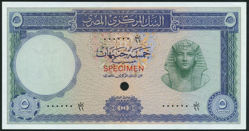 (†) Central Bank of Egypt, colour trial £5, ND (1961), blue and green, Tutankhamen at right, reverse blue and white, value