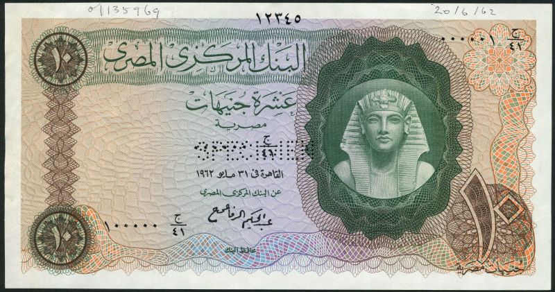 (†) Central Bank of Egypt, specimen 10 pounds, 1962, dark green and muticoloured, Tutankhamen at right, one example printed in full with signature 11, one with serial numbers and signature omitted and one with only background detail on obverse and reverse