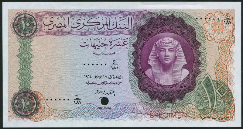 (†) Central Bank of Egypt, specimen colour trial 10 Pounds, 1964, zero serial numbers, signature 12, purple and green on multicoloured underprint, mask of Tutankhamen at right, reverse green, denomination in guilloche at left, overprinted SPECIMEN in red on obverse and reverse, one punch hole