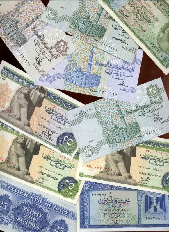 Central Bank/National Bank of Egypt, 25 piastres, 1952, green and multicoloured, Tutankhamen at right, also Central Bank 25 piastres (2), 1961,1966, blue, arms at right, 25 piastres (3), 1969,1974,1976, green, Sphinx, 25 piastres (4), 1979-), the Al-Sayida Aisha Mosque at centre